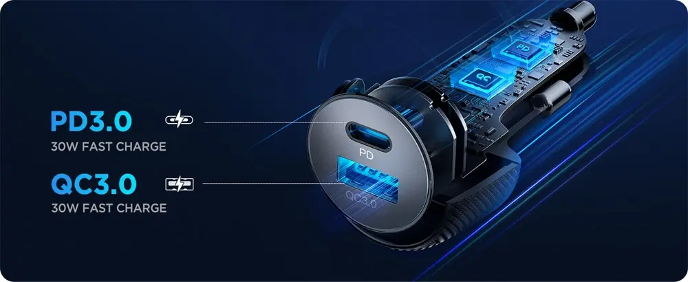 2.[Charge super rapide simultanée PD30W & QC30W]Avec chargeur de voiture PD30W Charge rapide pour PD3.0/PPS sur sortie Type-C et chargeur de voiture QC30W Charge rapide pour QC3.0