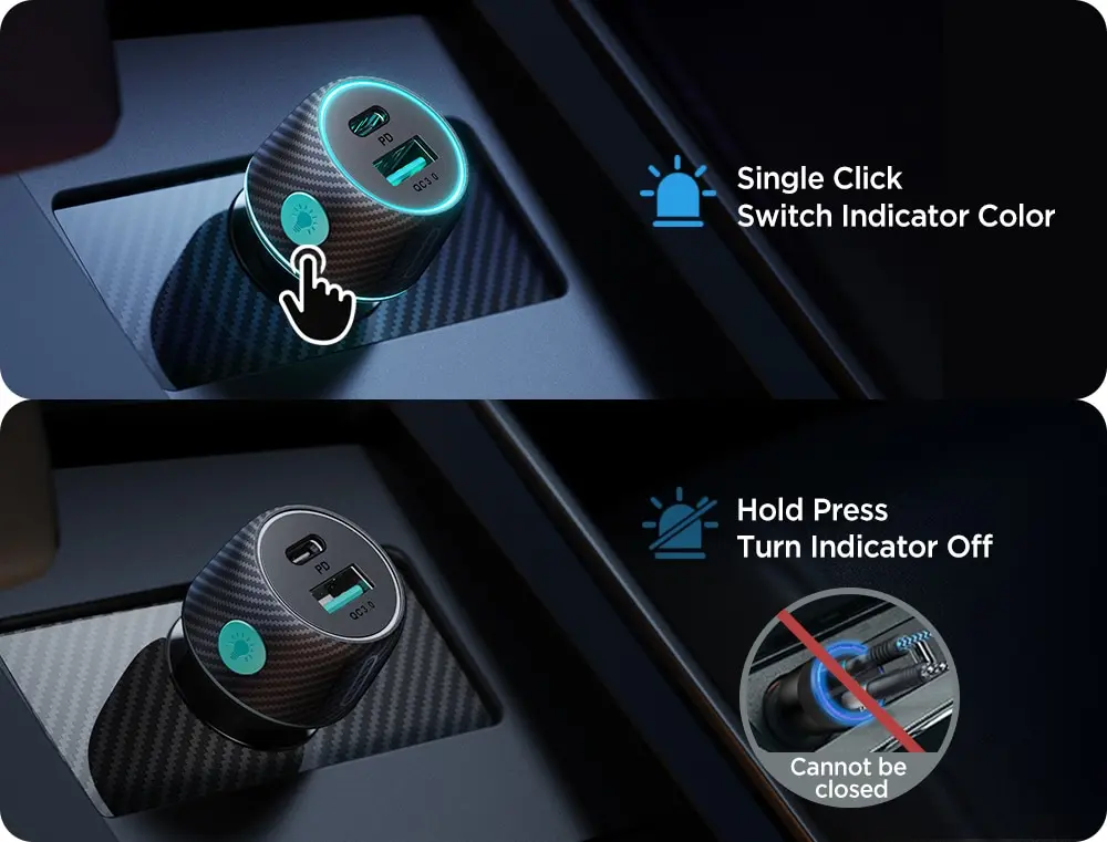 3.[Bande d’atmosphère LED contrôlable à 7 couleurs]L’adaptateur de chargeur de voiture contrôlable par LED à 7 couleurs Joyroom a 7 couleurs de LED différentes disponibles pour la sélection et 8 états de lumière.